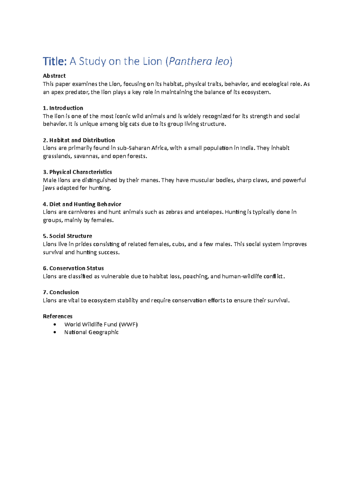 A Study on Panthera leo: Habitat, Behavior, and Conservation - Studocu