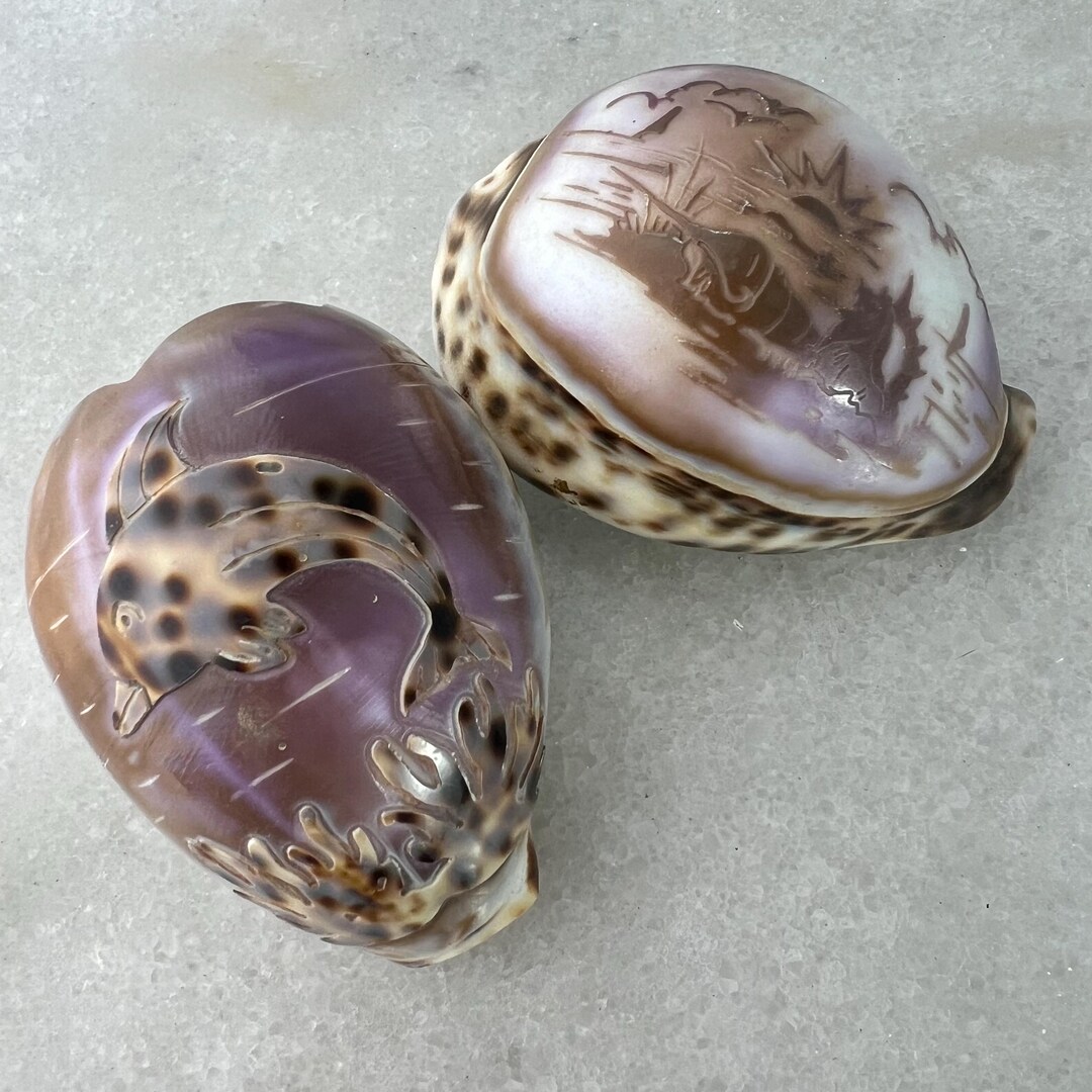 Hand Carved Bali Tiger Cowrie Sea Shell Set of 2, Leopard Spot, Dolphin ...