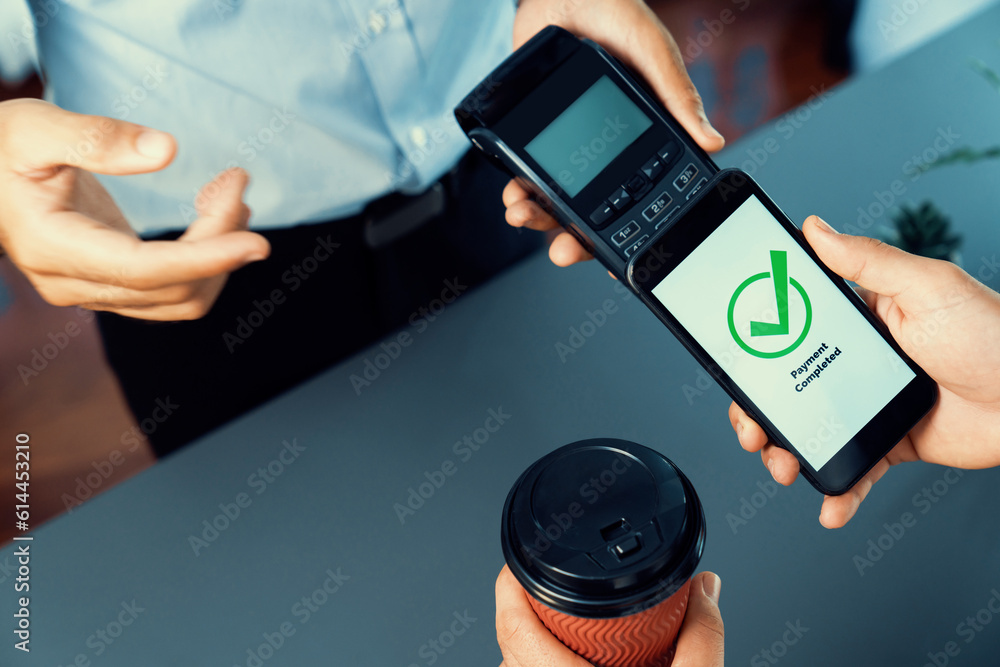 Hand holding smartphone with NFC QR code device, scanning contactless ...
