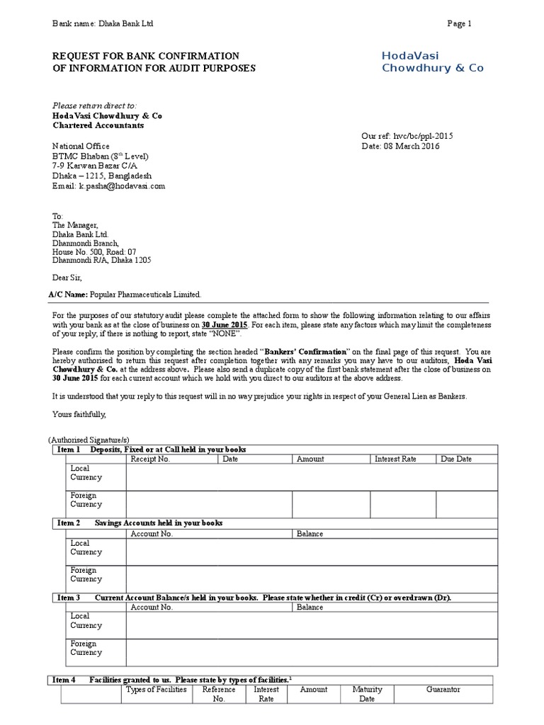 Bank Confirmation Letter Template For Auditor - Infoupdate.org