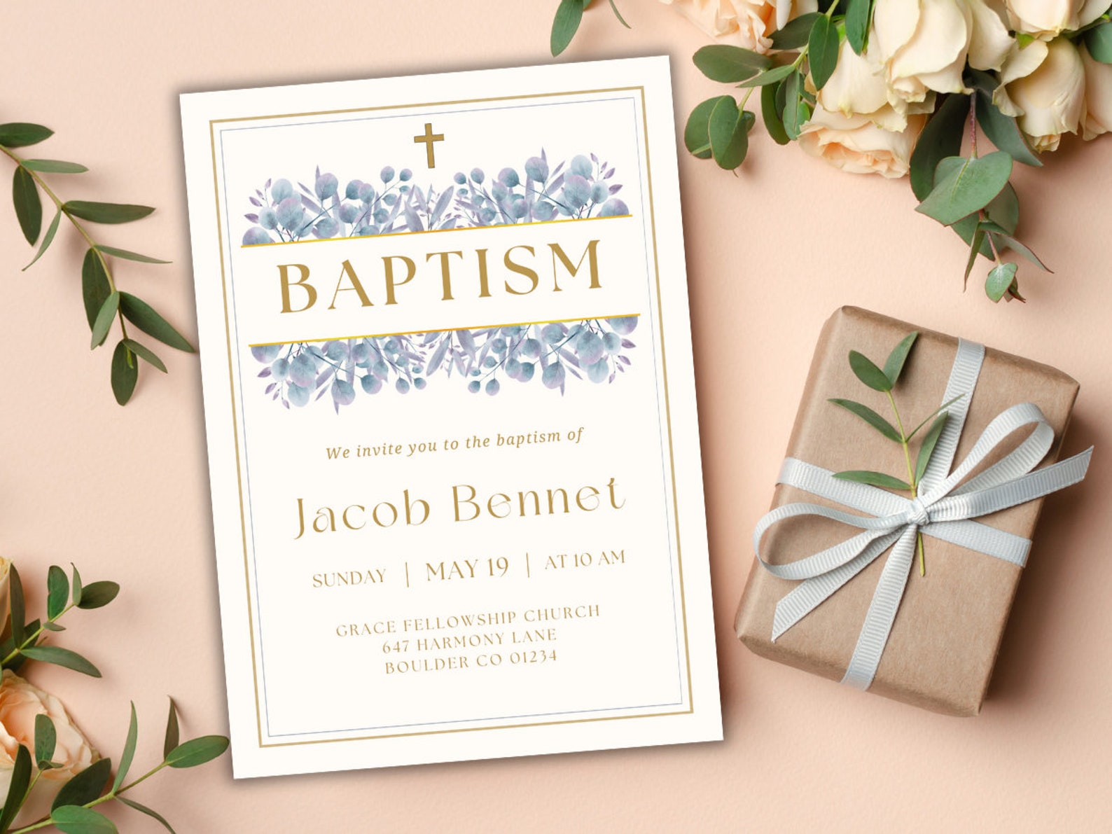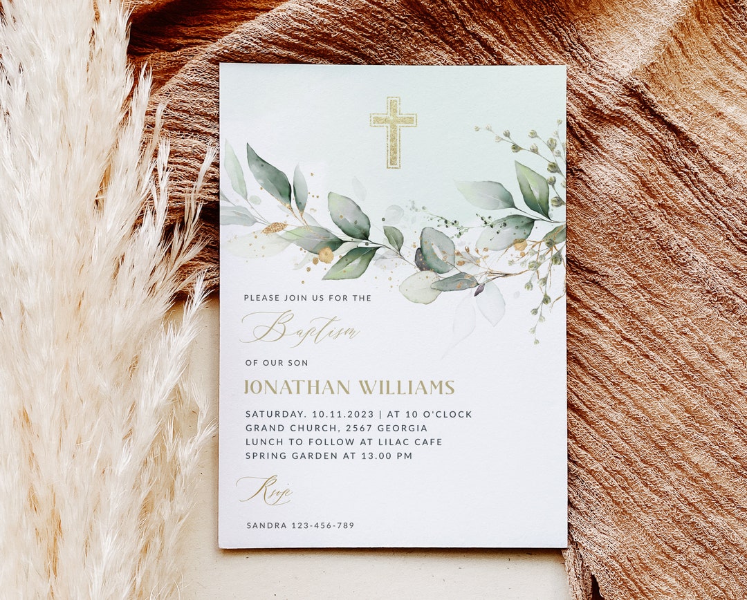 Baptism Invitation Template, Editable Baptism Invite, Greenery Baptism ...