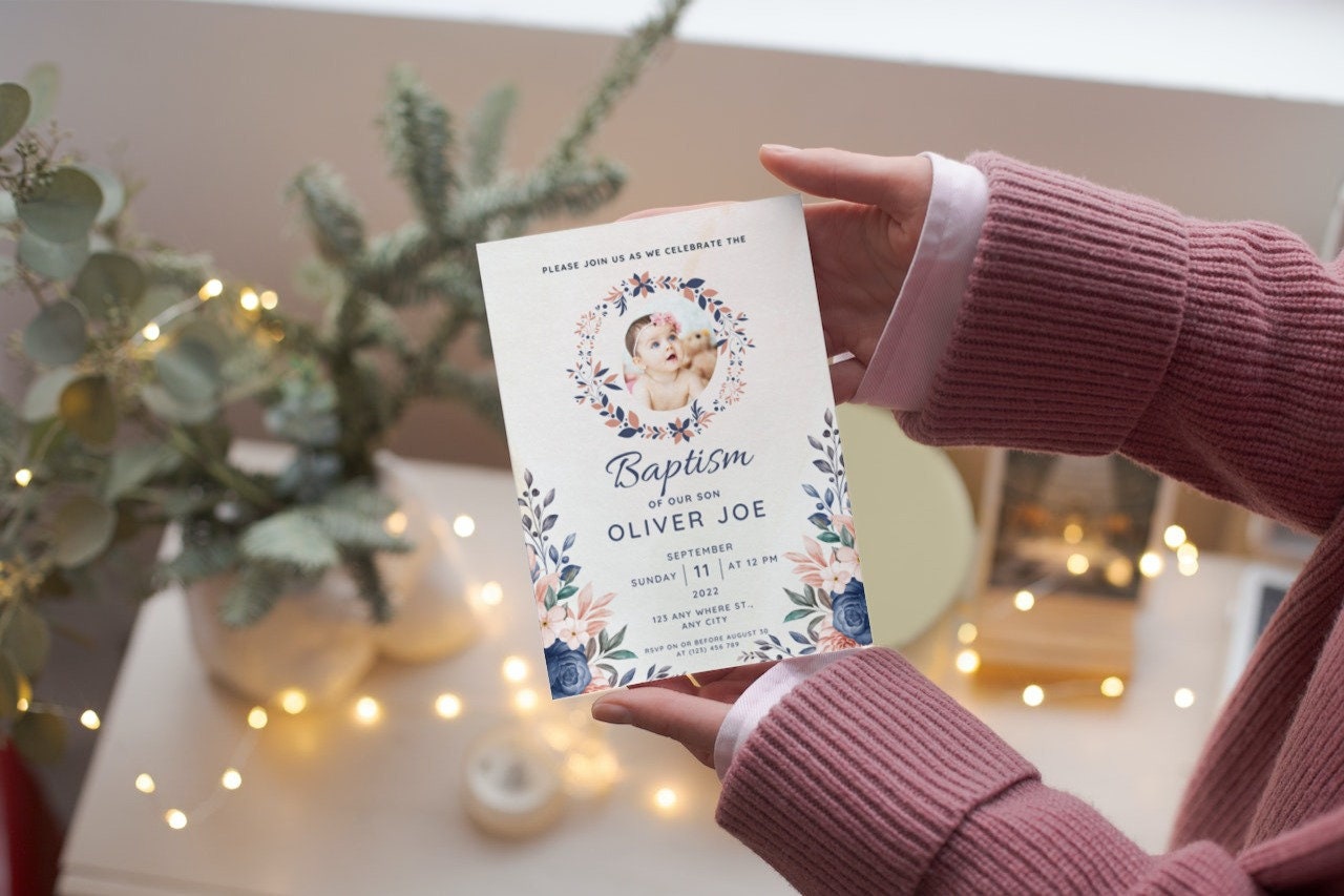 Baptism Invitation - Editable Template - Blue and Floral - Elegant ...