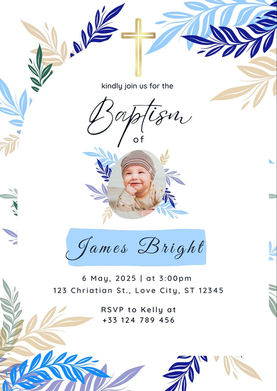 Personalized Baptism Invitation Template, Blue & Gold Floral (printable ...