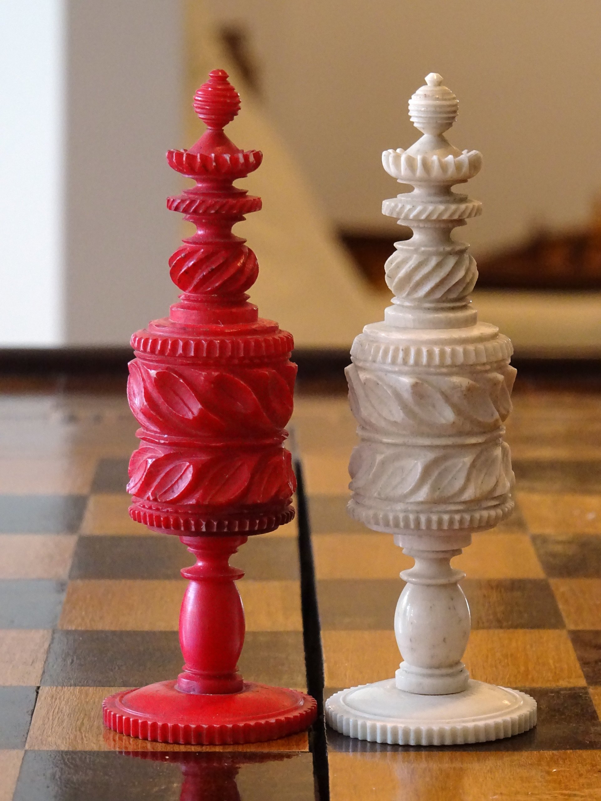 Lot - Barleycorn Pattern Bone Chess Set in Red and White ca 1890