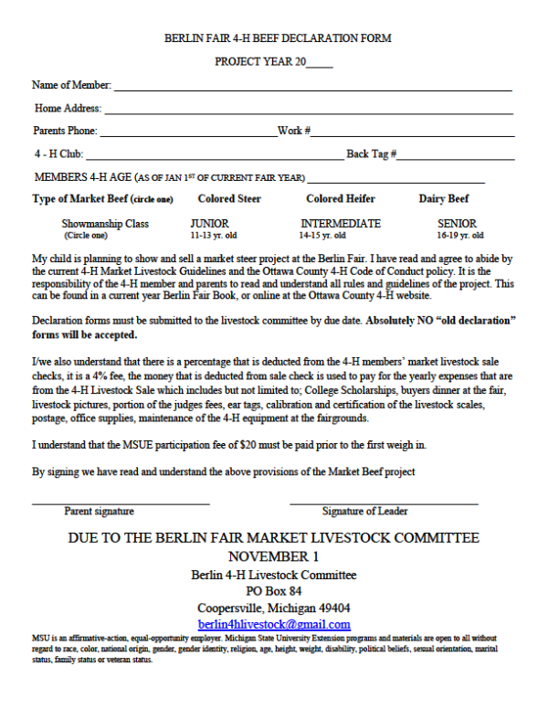 Berlin Fair 4-H Beef Declaration - Ottawa County