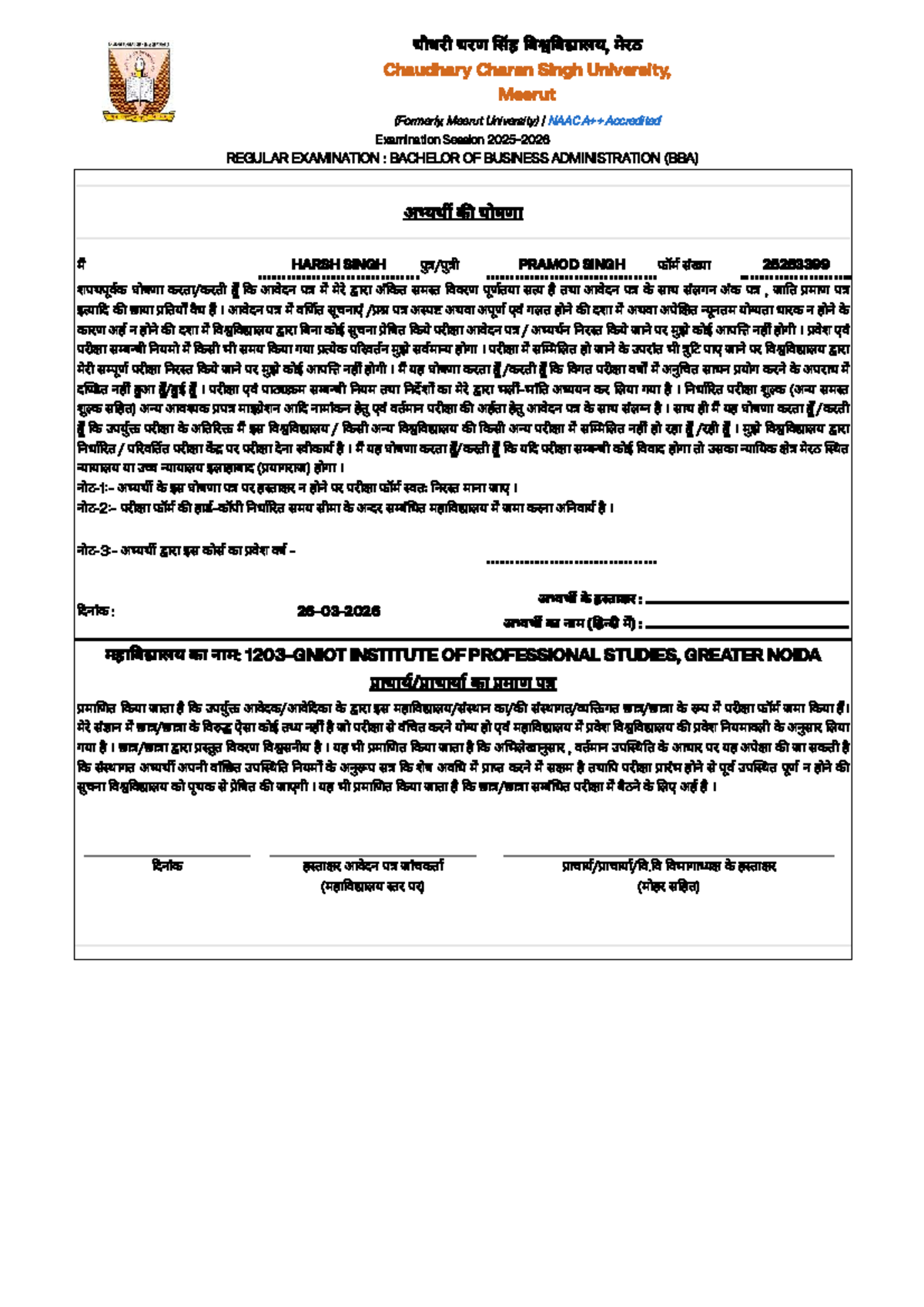 Declaration Form - BBA Regular Exam - Chaudhary Charan Singh University ...