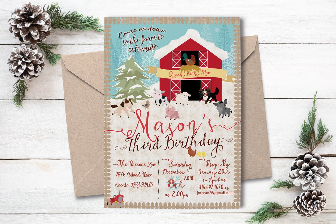 Winter Barnyard Birthday Invitation // Farm Animals Invitation | Etsy