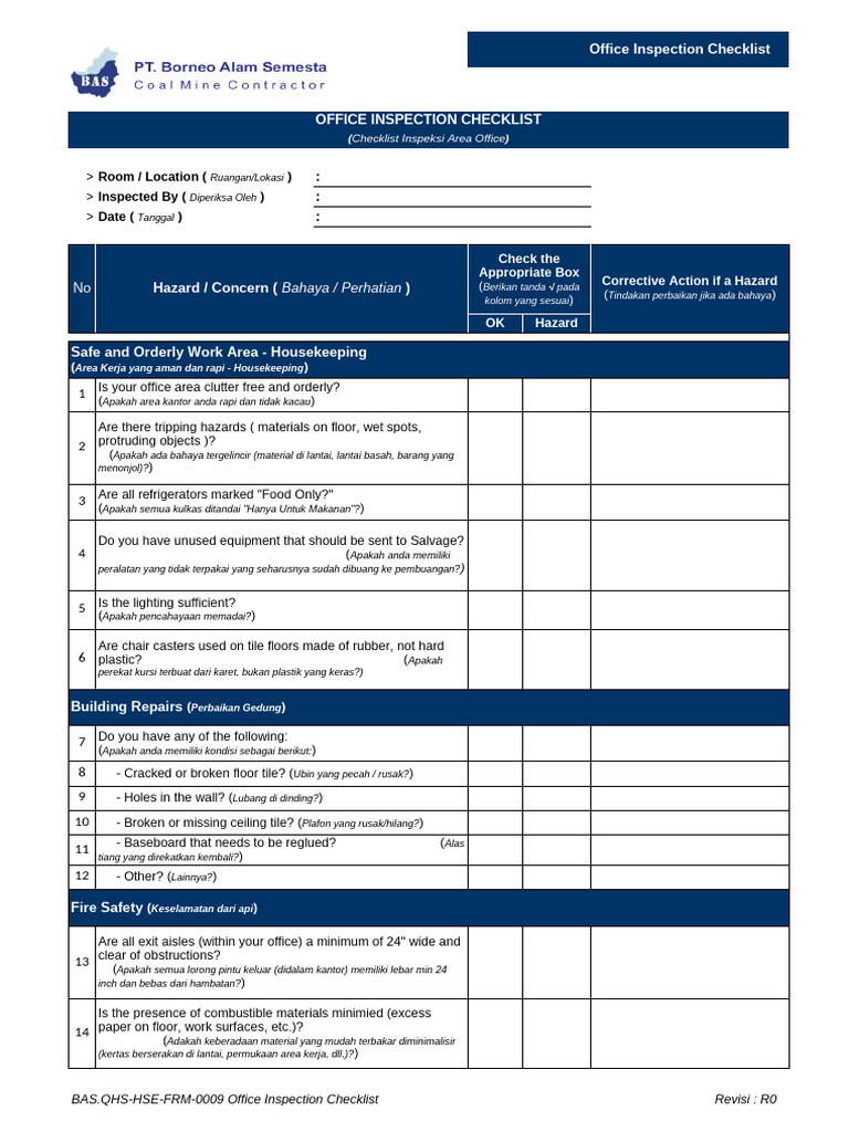 BAS - QHS-HSE-FRM-0009 Office Inspection CheckList | PDF