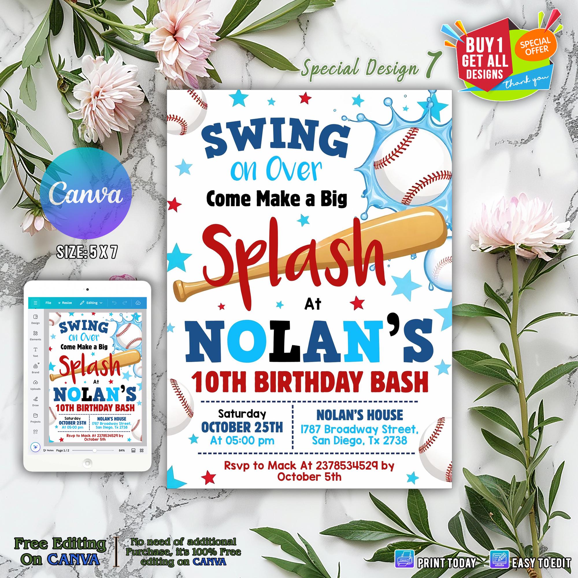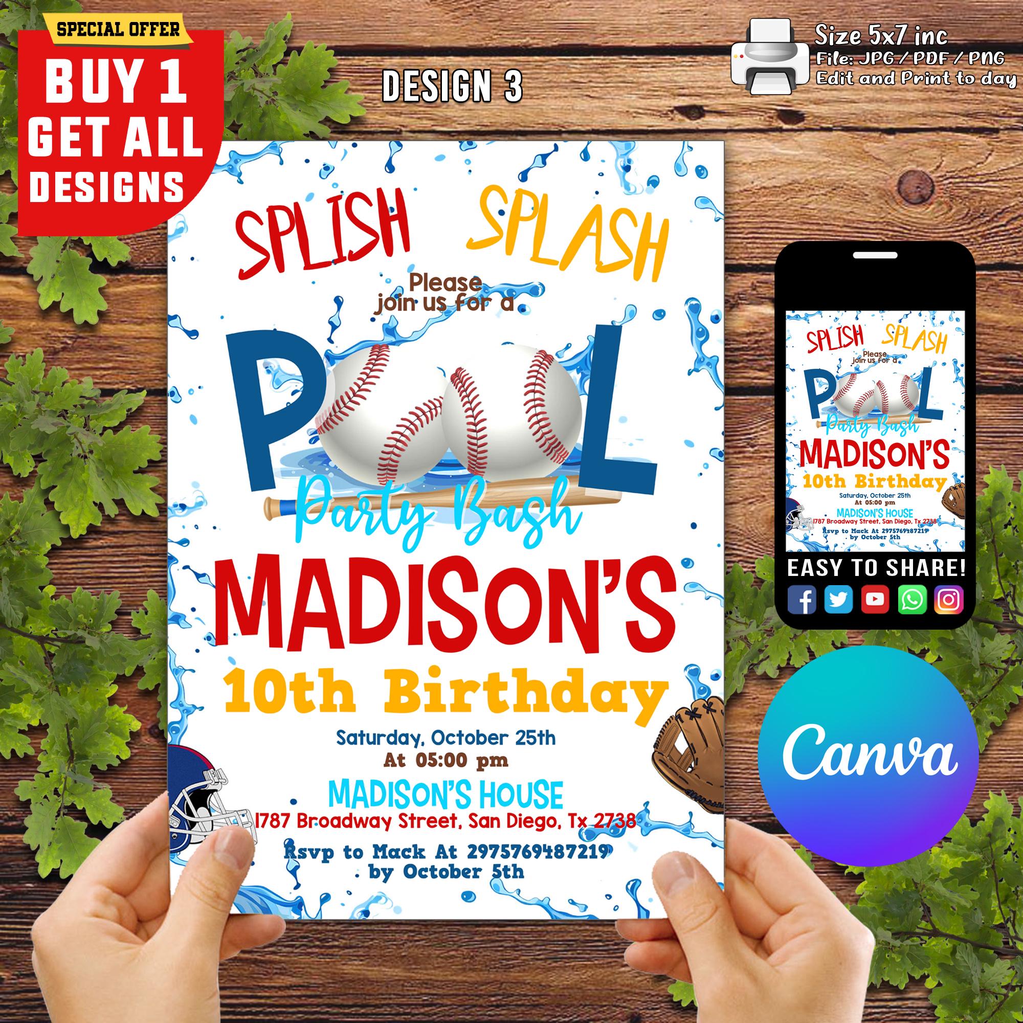 Baseball Pool Party Instant Editable Personalized Digital Summer ...