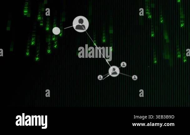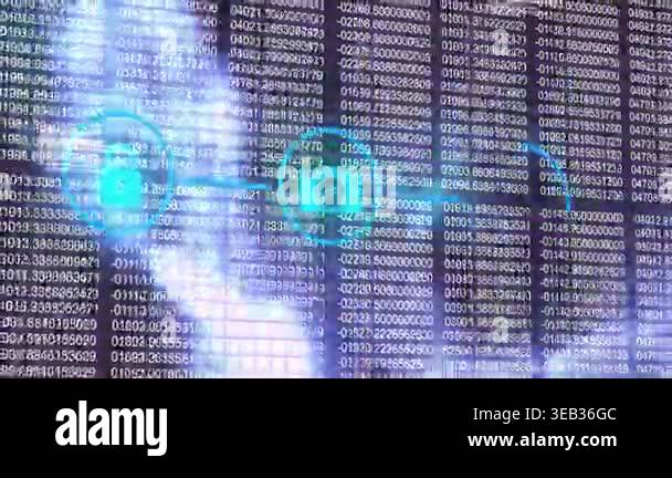 Animation of network of connections with icons over binary coding data ...
