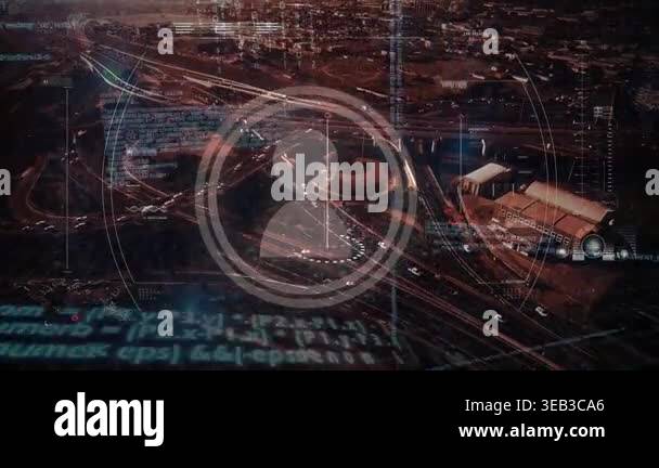 Animation of network of icons and data processing over landscape ...
