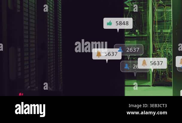 Animation of social media icons, data processing over network of ...