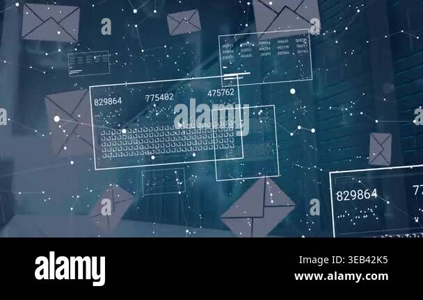 Animation of envelope icons and digital data processing over computer ...