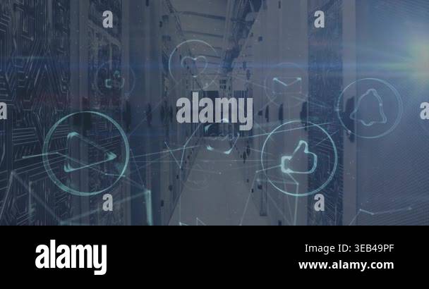 Animation of network of connections with icons over data processing ...