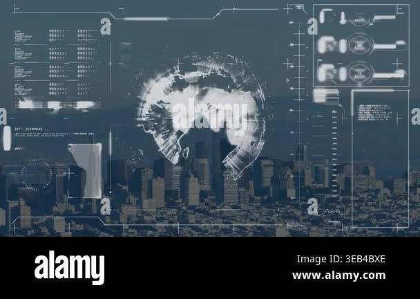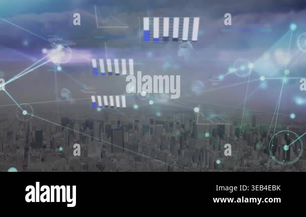 Animation of data processing and icons over cityscape. Global ...