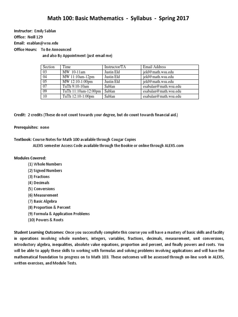 Math 100: Basic Mathematics - Syllabus - Spring 2017 | PDF | Tutor ...