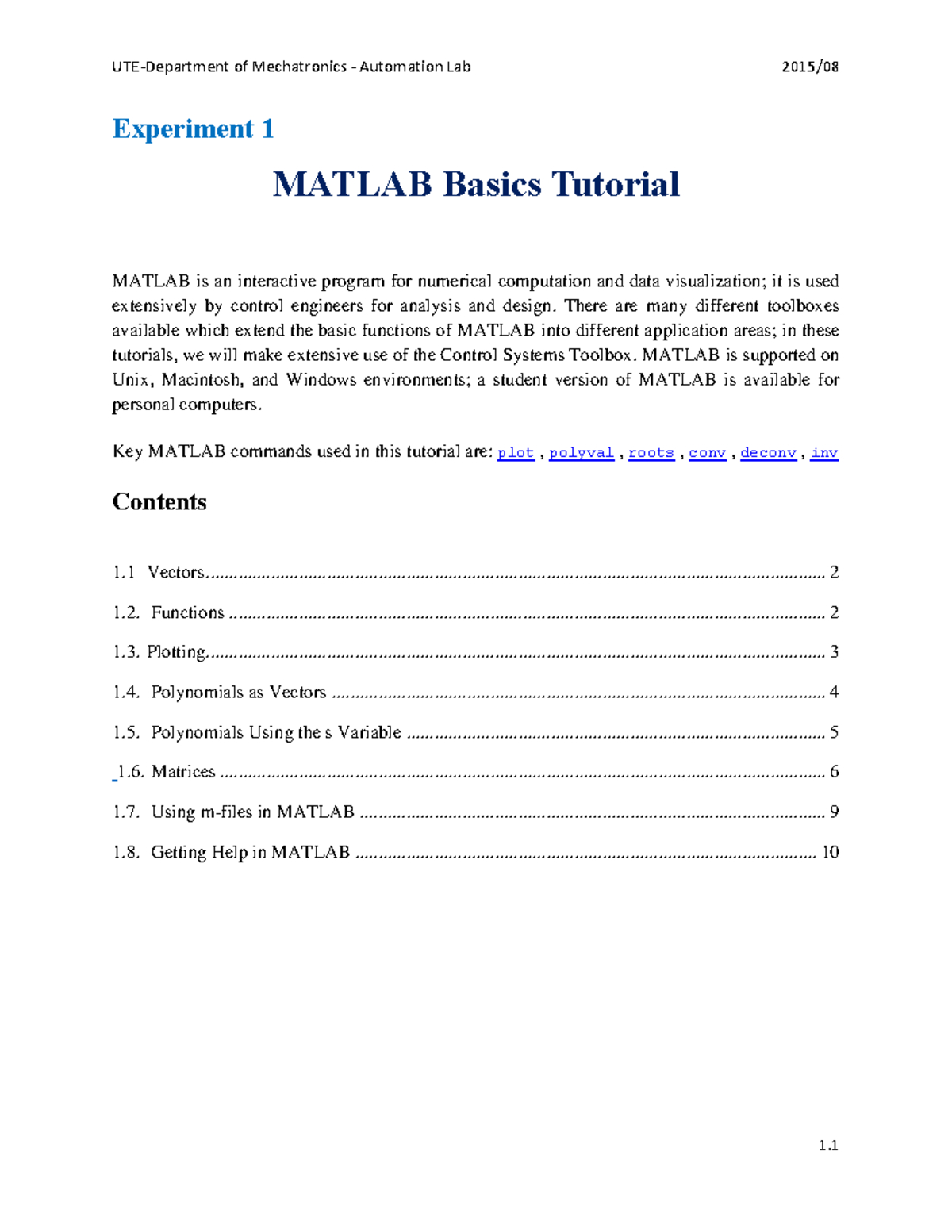 01 Matlab Basics Tutorial A - Experiment 1 MATLAB Basics Tutorial ...