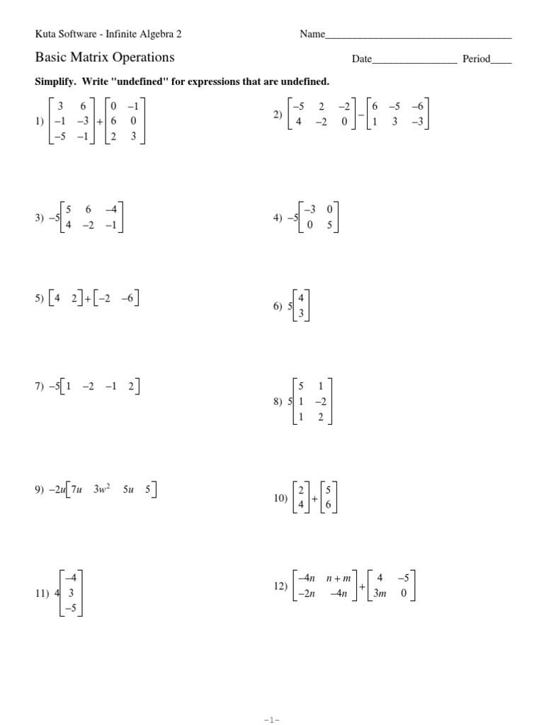 Basic Matrix Operations Worksheet – Addition/Subtraction/Scalars ...