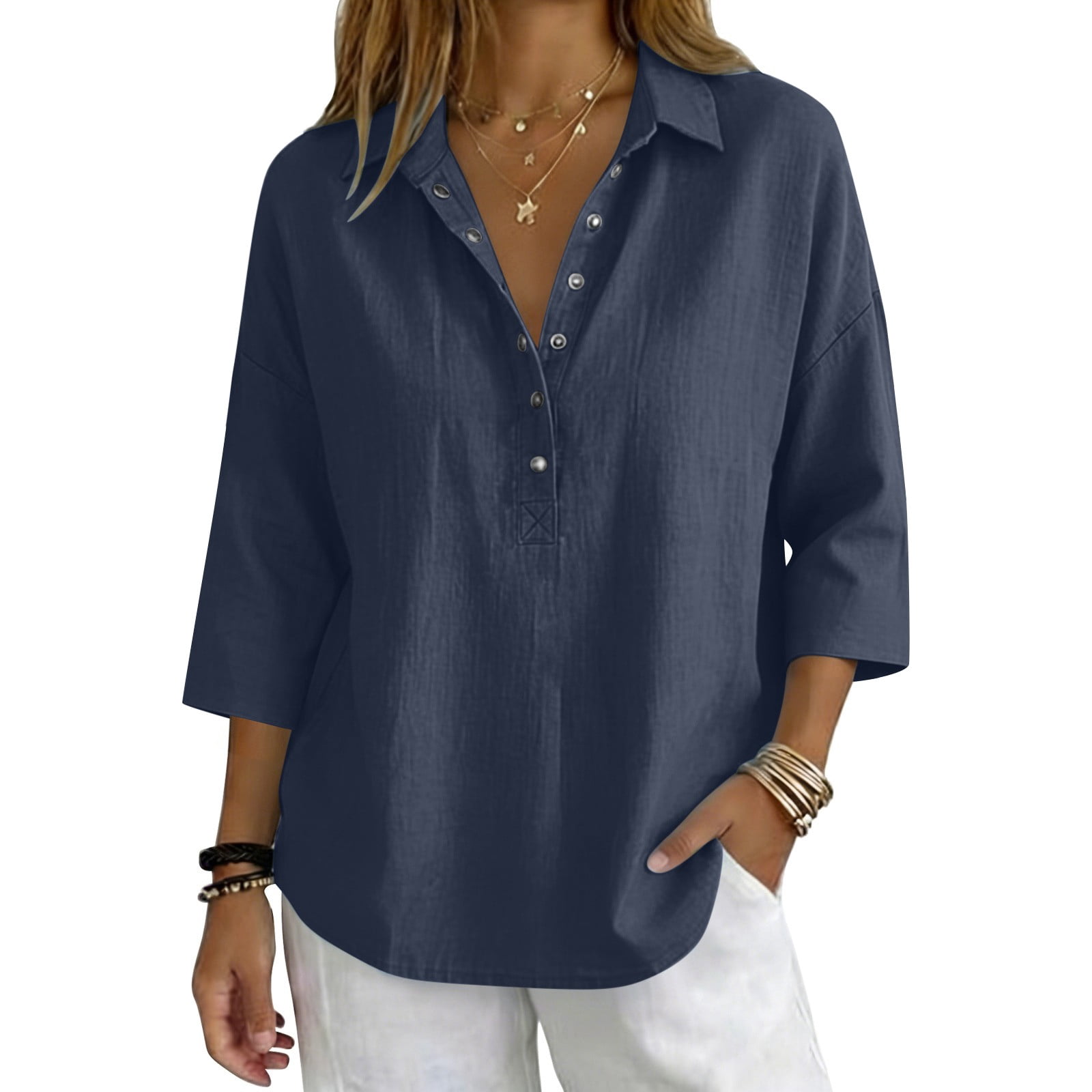 Cotton Linen Polo Shirt Half Button Placket Loose Casual Tops ...