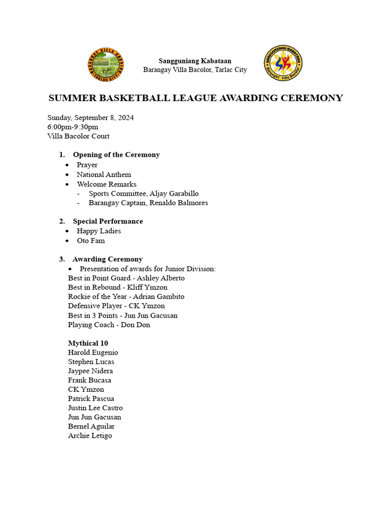 Basketball League Opening Ceremony Program | PDF | Sports | Leisure