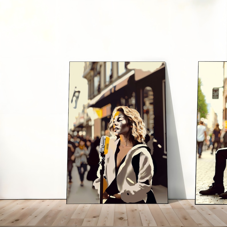 Woman singing on the street with a guitarist. Busking. Street musician ...