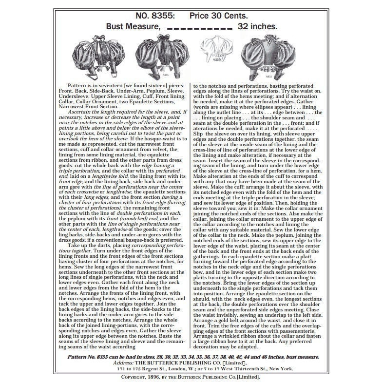 Past Patterns 8355 - Mid 1890s Basque Waist Pattern Bust Sizes 32-34 ...