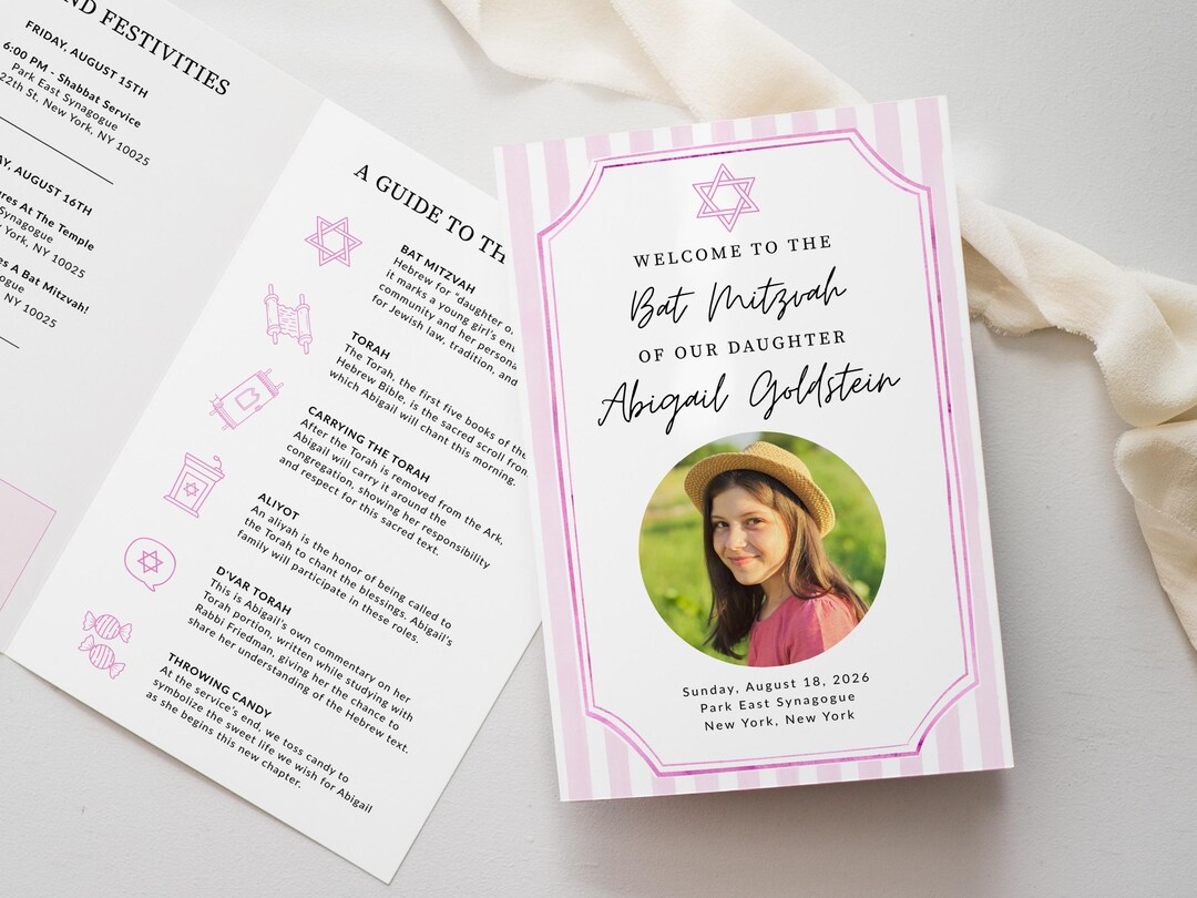 Bat Mitzvah Program Template, Pink Stripe Jewish Ceremony Folded ...