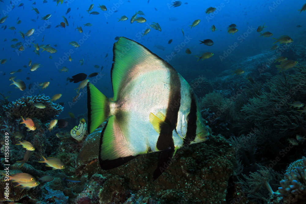 Beautiful bright fish Platax teira, Longfin Batfish in blue water of ...