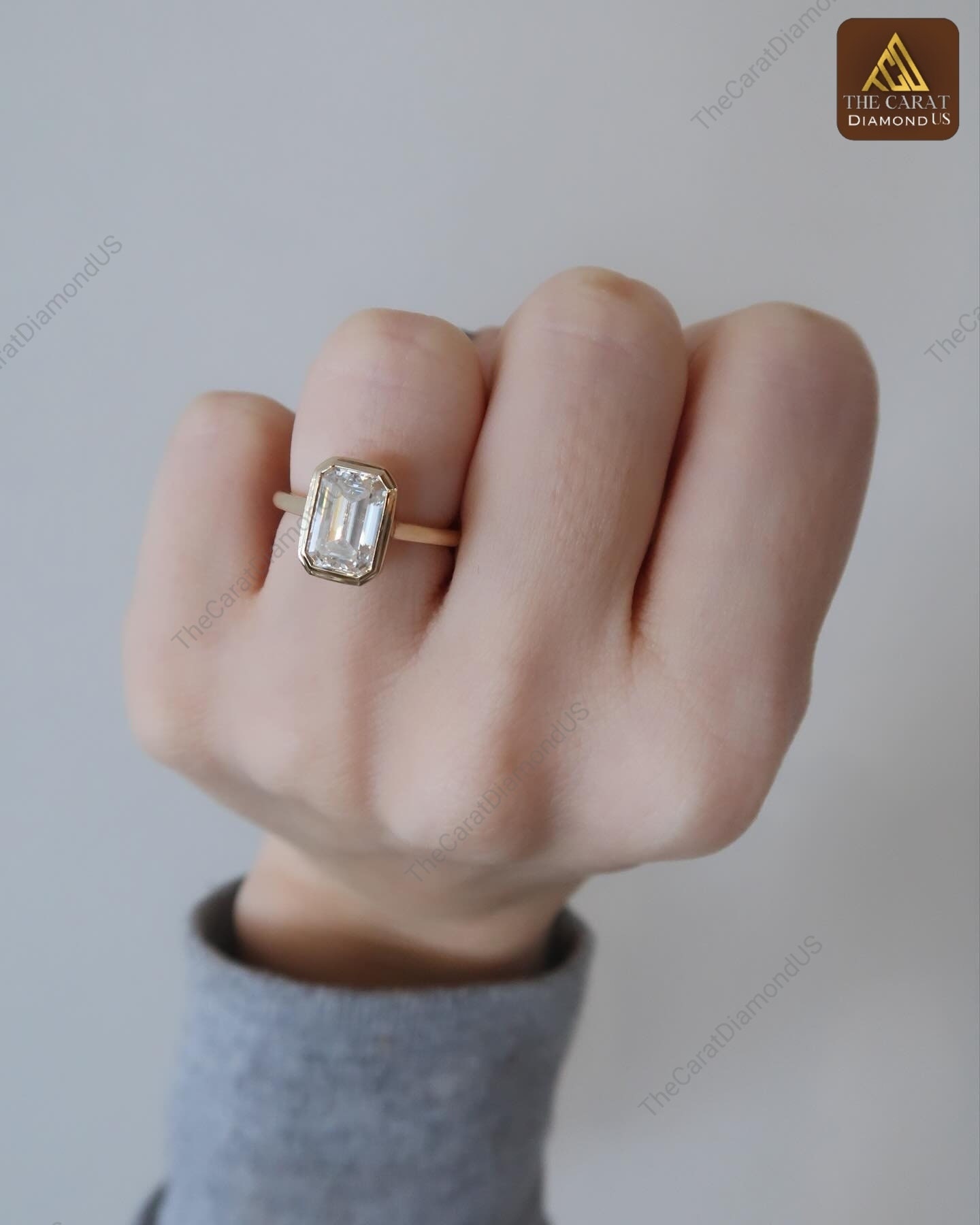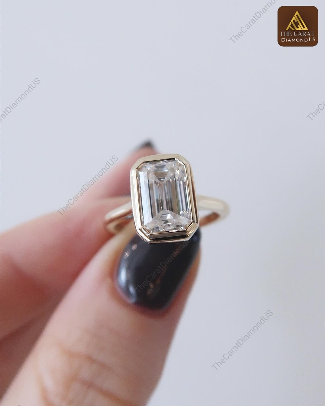 Emerald Cut Moissanite Bezel Set Engagement Ring, Emerald Diamond ...