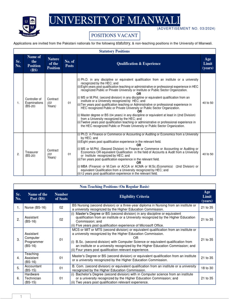 Statutory Non Teaching Vacant Positions Advertisement No. 032024 UMW ...