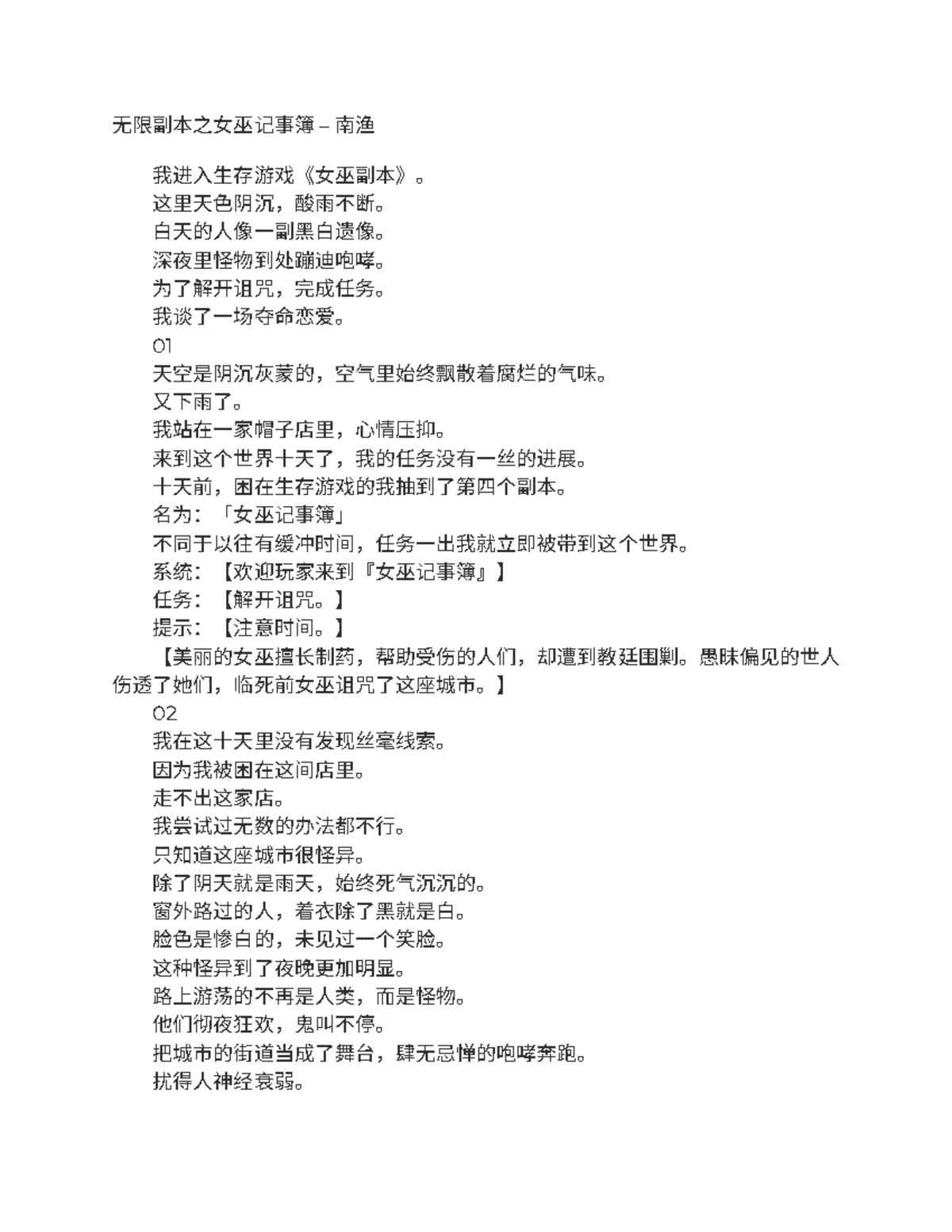P4 - Bbbbbh - 无限副本之女巫记事簿 – 南渔 我进入生存游戏《女巫副本》。 这里天色阴沉,酸雨不断。 白天的人像一副黑白遗像 ...
