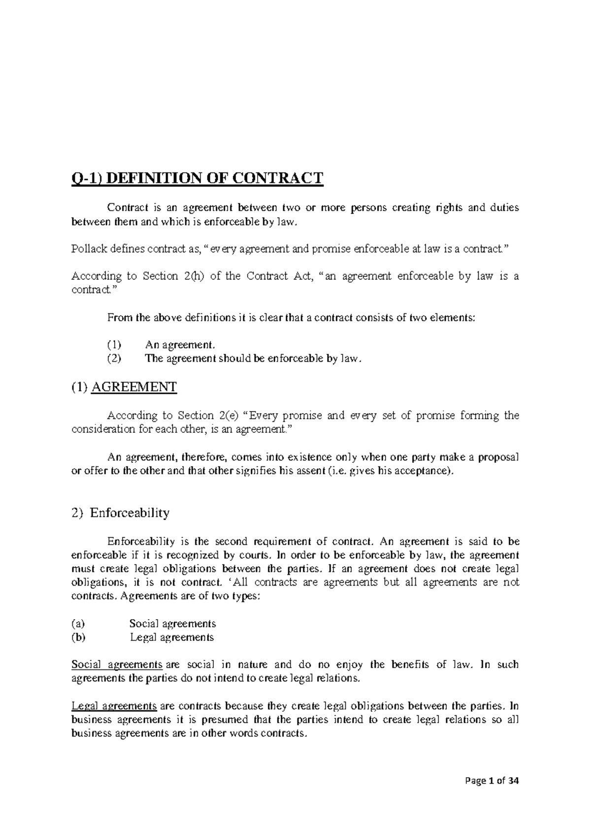 BLT notes - Q-1) DEFINITION OF CONTRACT Contract is an agreement ...
