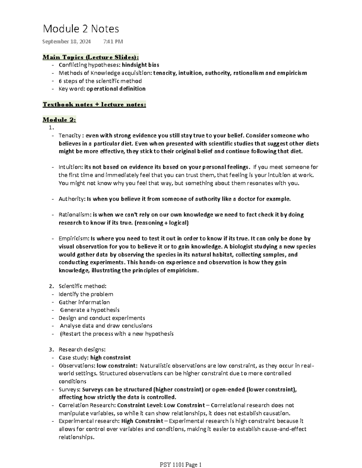 Module 2 Notes - PSY 1101 - Main Topics (Lecture Slides): - Conflicting ...