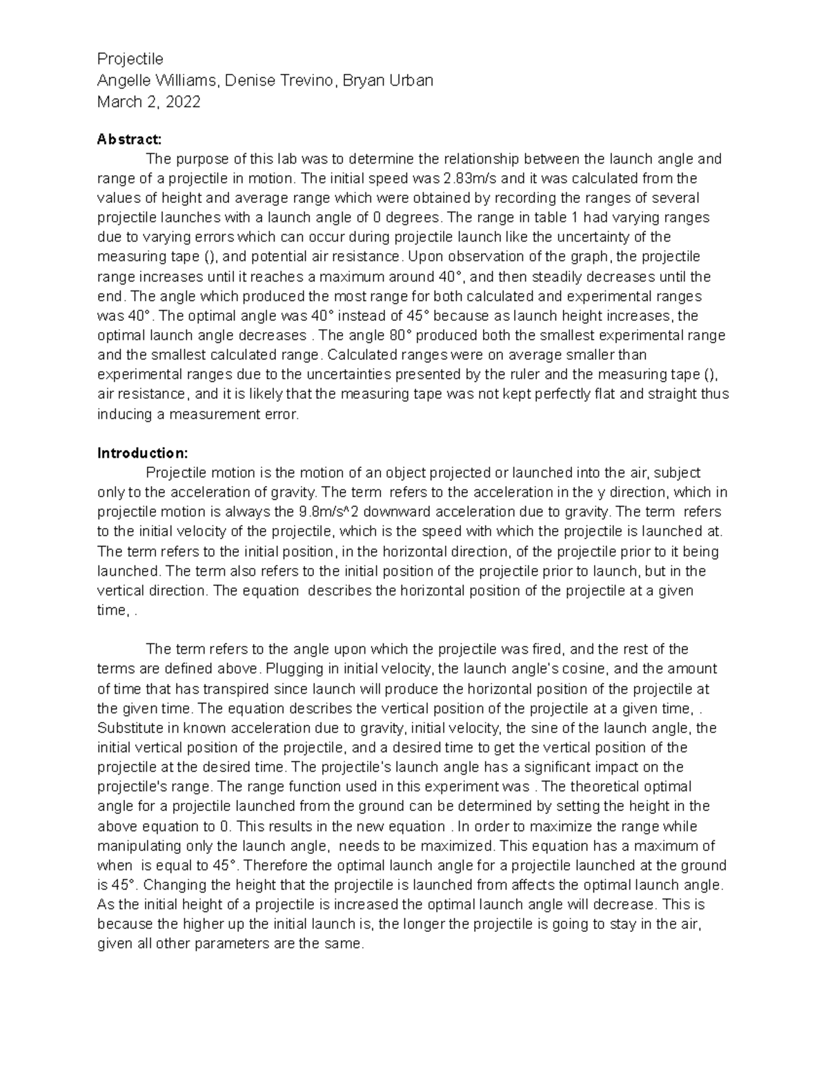 Notes Observations - Projectile Angelle Williams, Denise Trevino, Bryan ...
