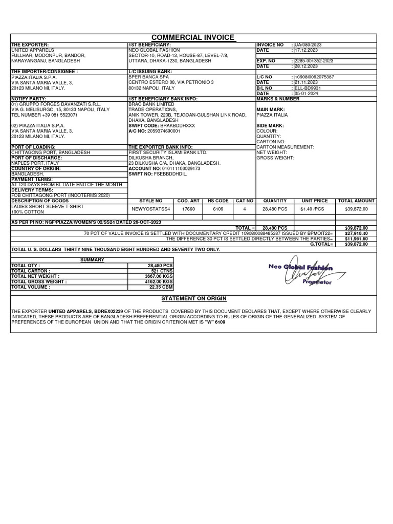 Bangladesh Export Invoice for T-Shirts | PDF