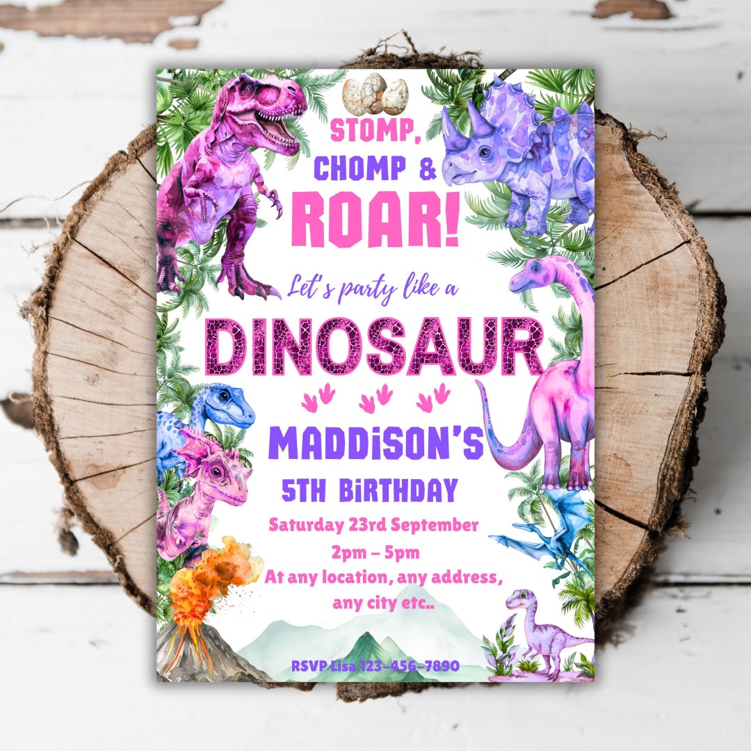 Printable Dinosaur Birthday Invitation Girls Stomp Chomp and Roar Dino ...