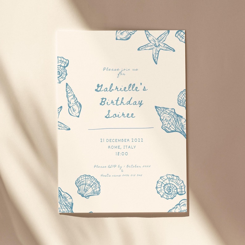 Hand Drawn Pale Blue Illustrated Beach Shell Birthday Soiree Invite ...