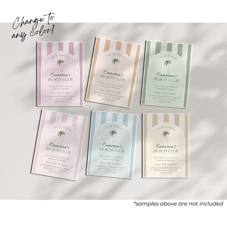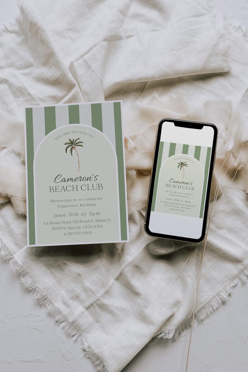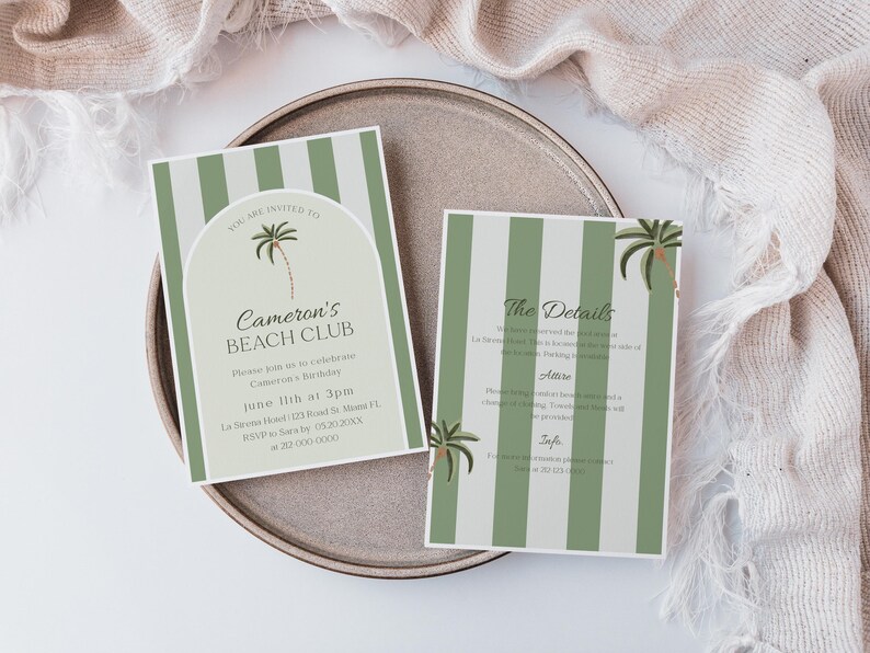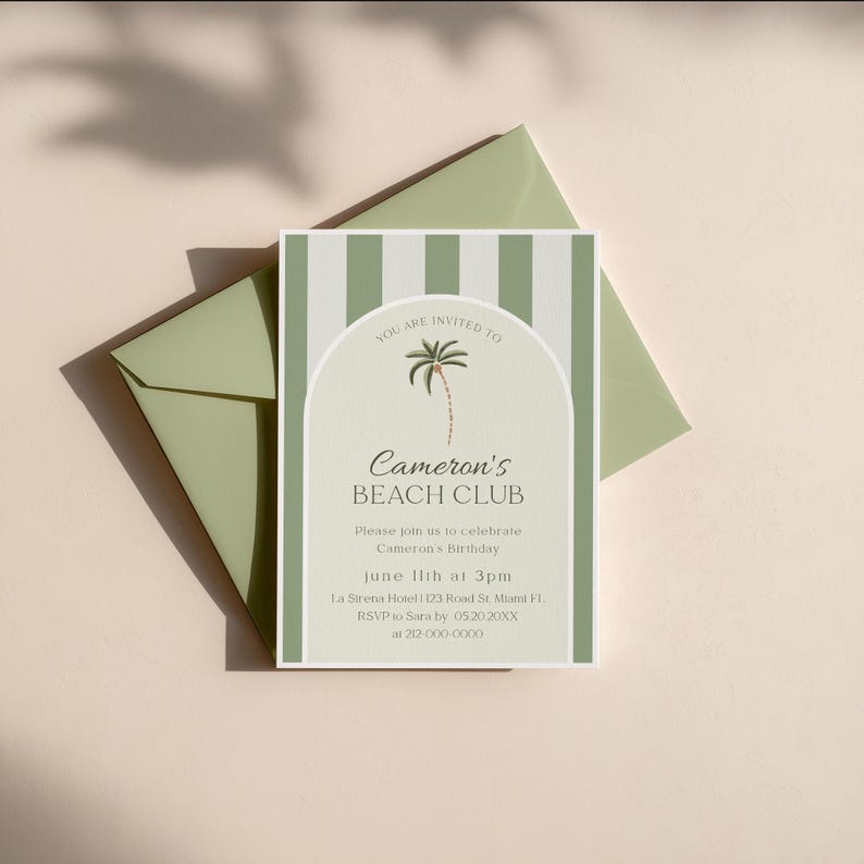 Beach Club Birthday Invitation Printable Green Cabana Theme Birthday ...