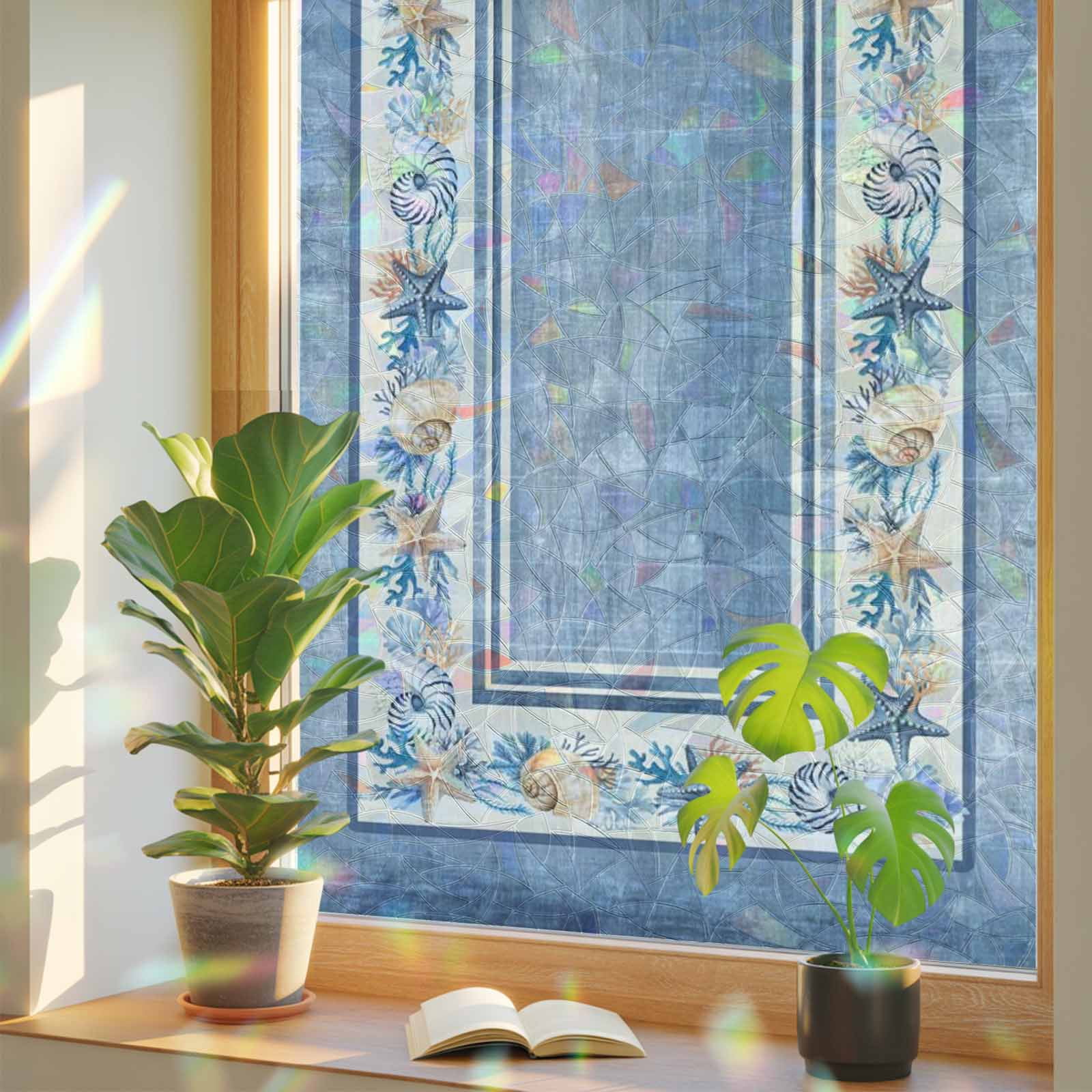 Blue Coastal Window Privacy Film, Vintage Beach Starfish Shell Summer ...