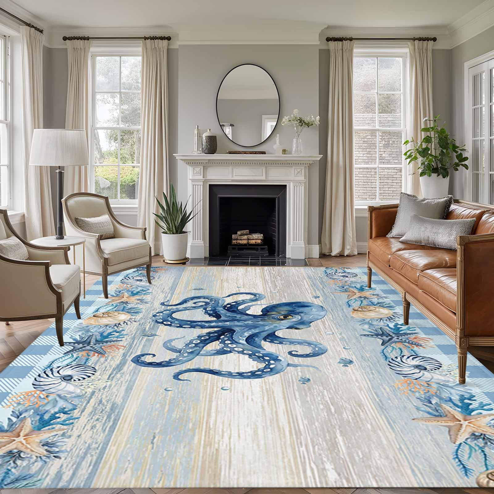 Blue Octopus Coastal 8'x10' Large Area Rugs Summer Starfish Beach Coral ...