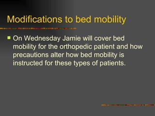 Bed Mobility Bed Mobility Basics Consider specific precautions