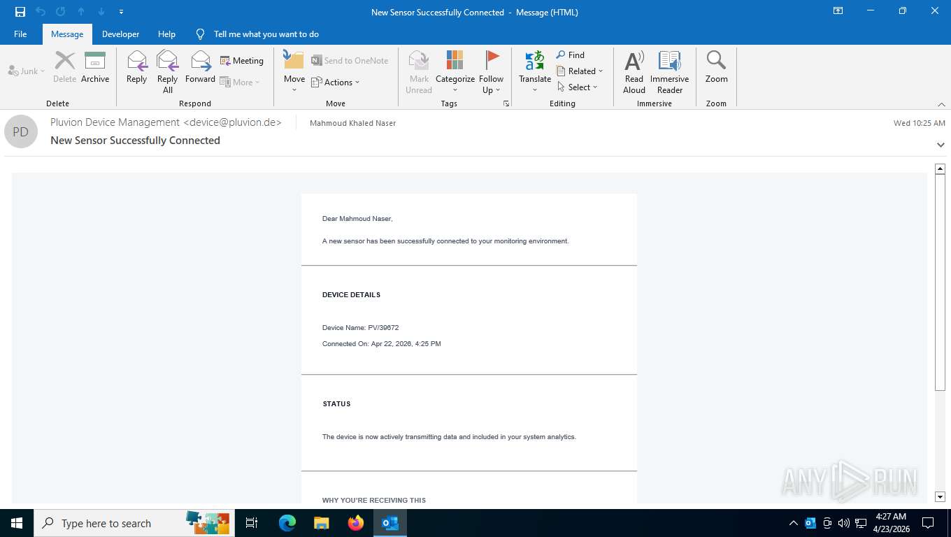 Malware analysis New Sensor Successfully Connected.msg No threats ...