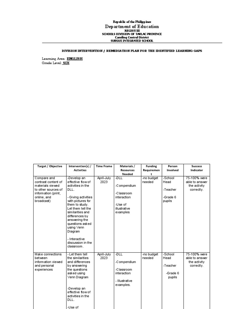 Learning Gaps Remediation Plan 2023 | PDF | Learning | Behavior ...