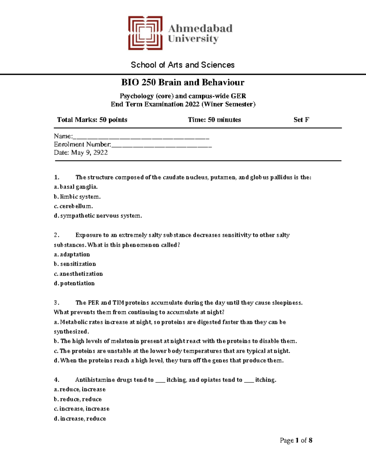 BIO 250 Brain and Behaviour Psychology End Term Exam 2022 - Studocu
