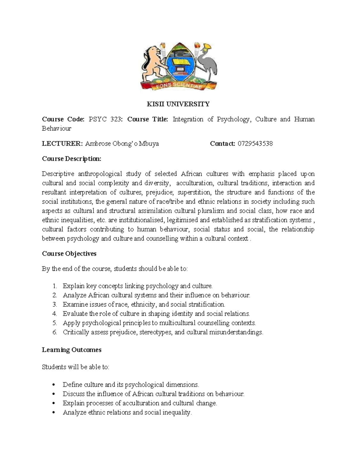 PSYC 323: Integration of Psychology, Culture & Human Behavior Course ...