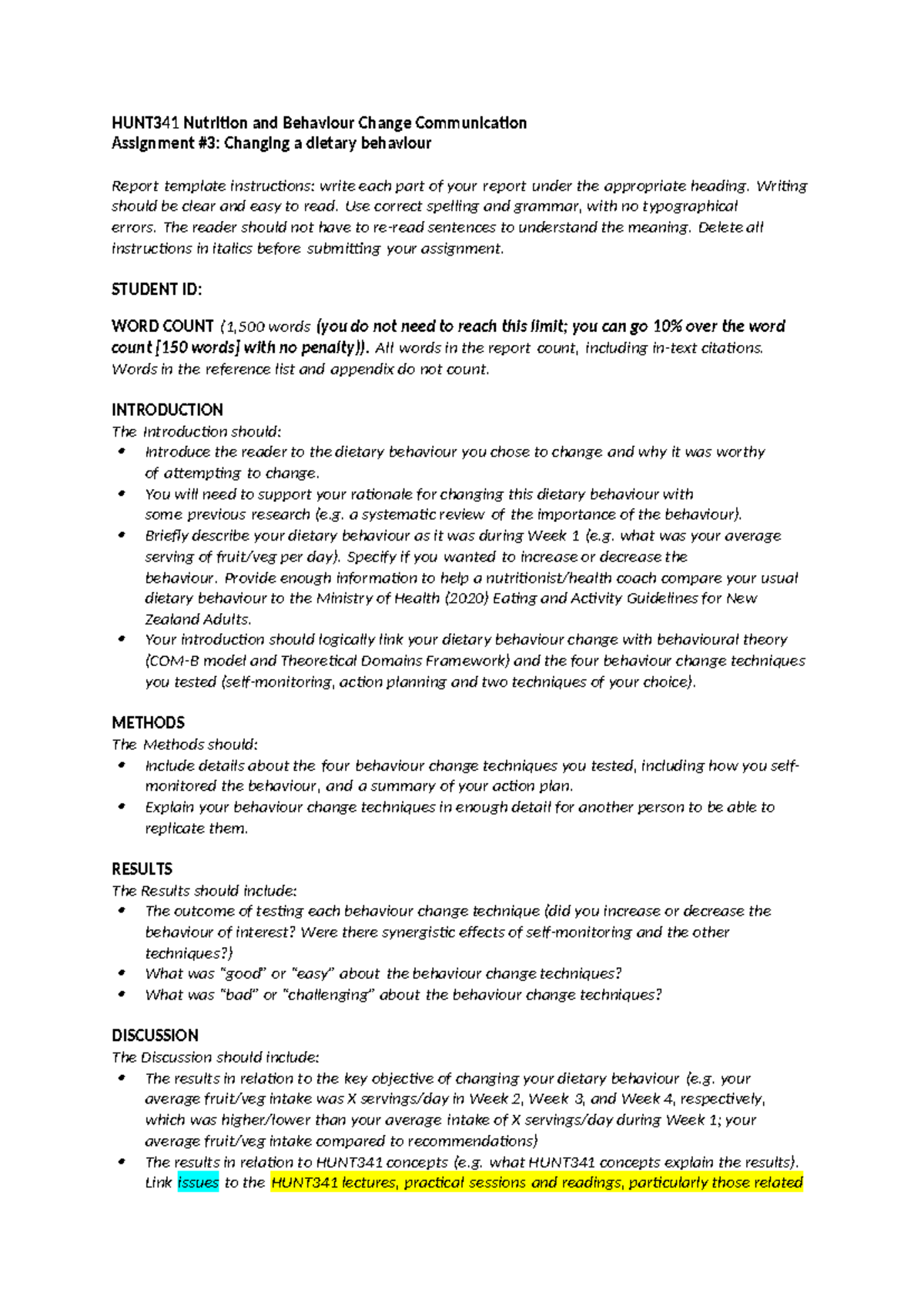 HUNT341 Assignment 3: Dietary Behaviour Change Report Template - Studocu