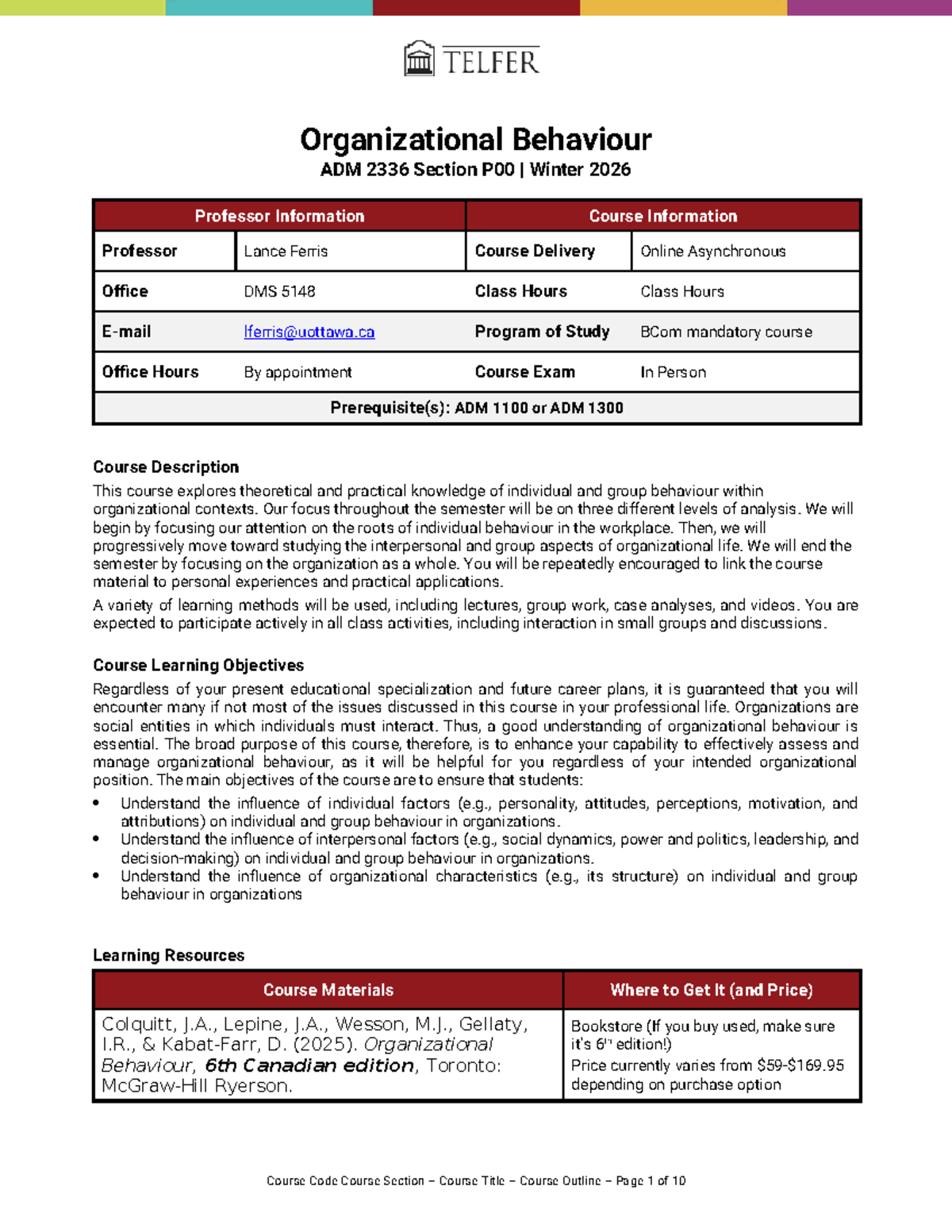 Organizational Behaviour Course Outline ADM 2336 P00 Winter 2026 - Studocu