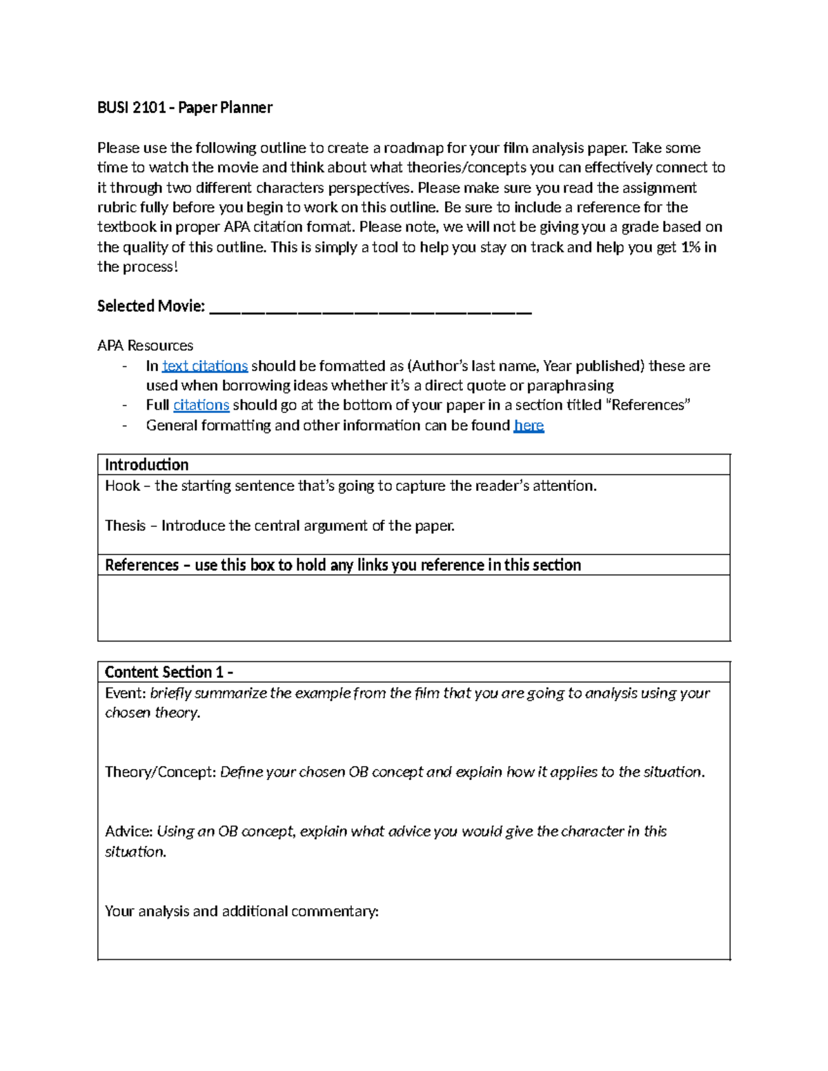 BUSI 2101 Film Analysis Paper Outline and Planner - Studocu