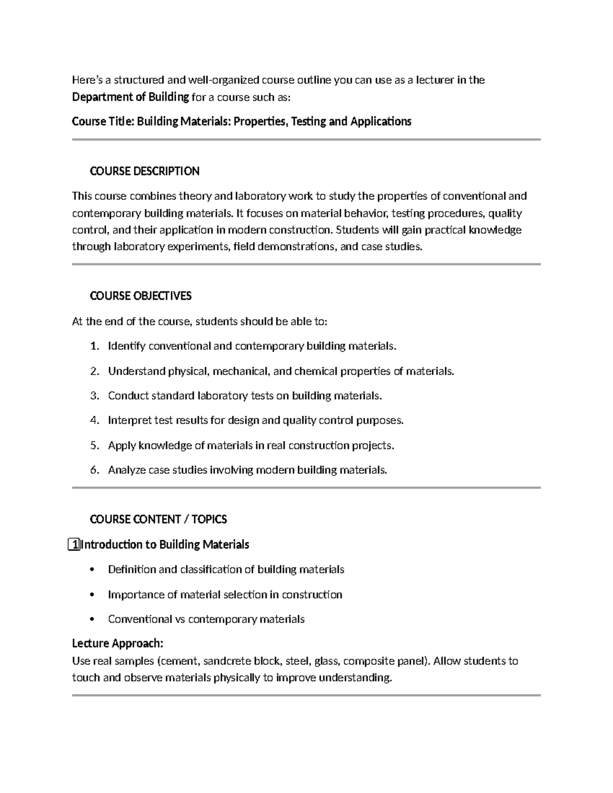 Building Materials: Properties, Testing & Applications Course Outline ...