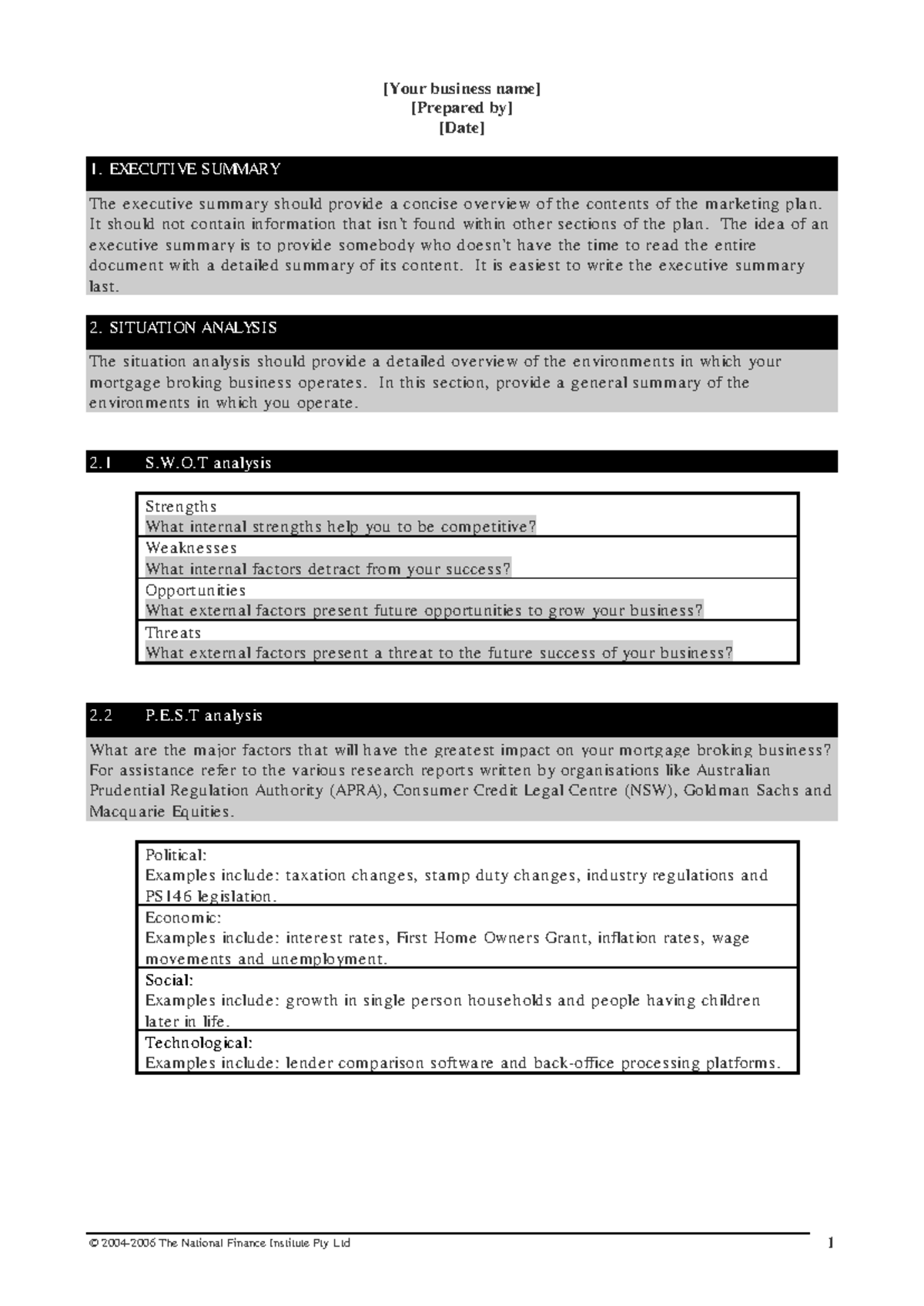 Marketing Plan Template for Business 1: Executive Summary & Analysis ...